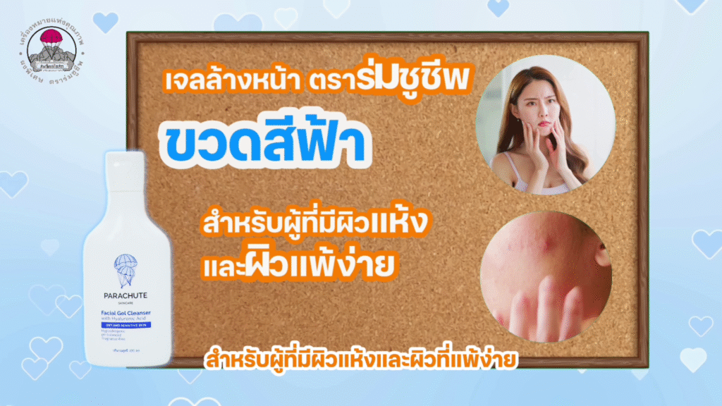 เจลล้างหน้าตราร่มชูชีพ ขวดสีฟ้า สำหรับผู้ที่มีผิวแห้งและผิวที่แพ้ง่าย มีค่า pH ที่สมดุลกับผิว มีไฮยาลูโรนิคแอซิด (AHA) ให้ความชุ่มชื้นกับผิว และสารล้างทำความสะอาดซึ่งอ่อนโยนต่อสภาพผิว ไม่ทำให้ผิวแห้งตึง ให้ความรู้สึกผิวหน้าสะอาด และนุ่มหลังล้าง