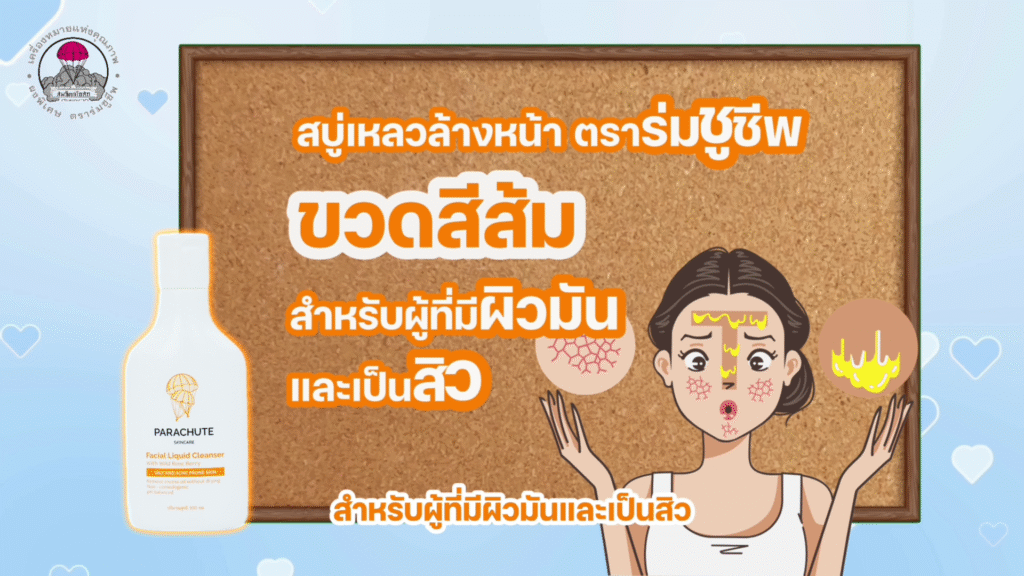 สบู่เหลวล้างหน้าตราร่มชูชีพ ขวดสีส้ม สำหรับผู้ที่มีผิวมันและเป็นสิว มีค่า pH ที่สมดุลกับผิว มีวิตามินบี 3 ช่วยให้ผิวชุ่มชื่น และ โรสฮิป (Wild Rose Berry ) ช่วยควบคุมและลดการหลั่งน้ำมันส่วนเกินอันเป็นสาเหตุของการเกิดสิว ช่วยให้รูขุมขนกระชับ ผิวเรียบเนียน ไร้สิว